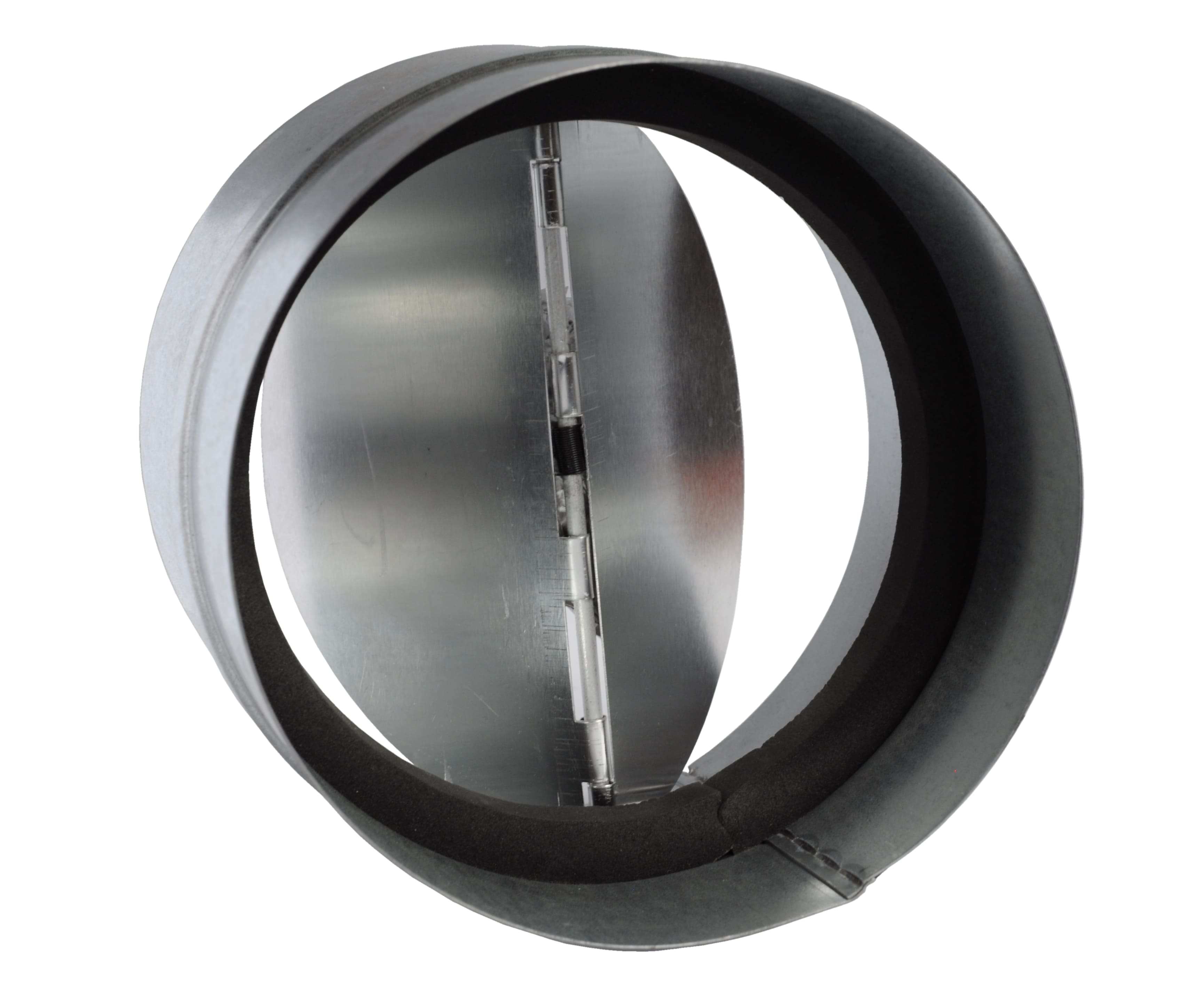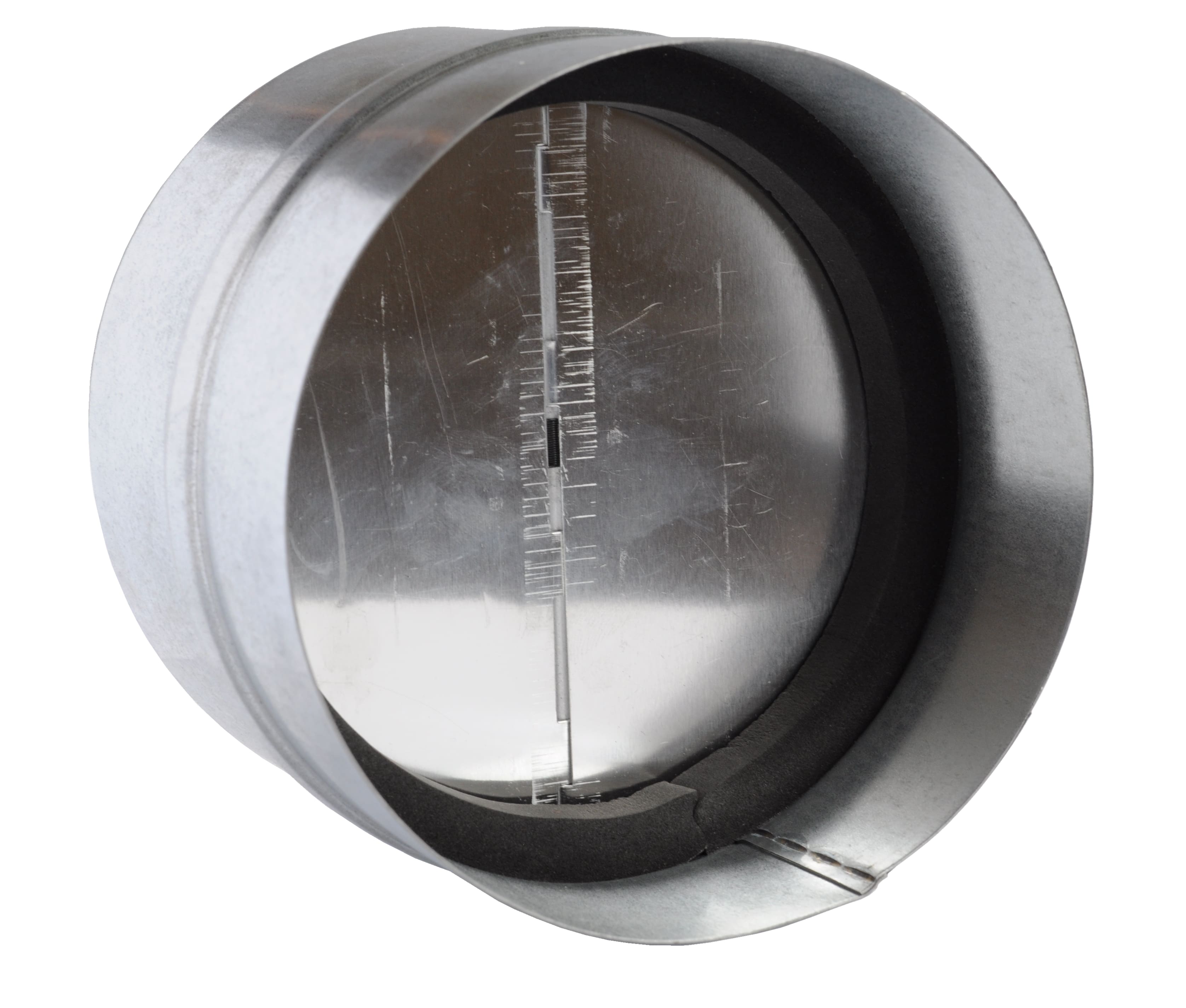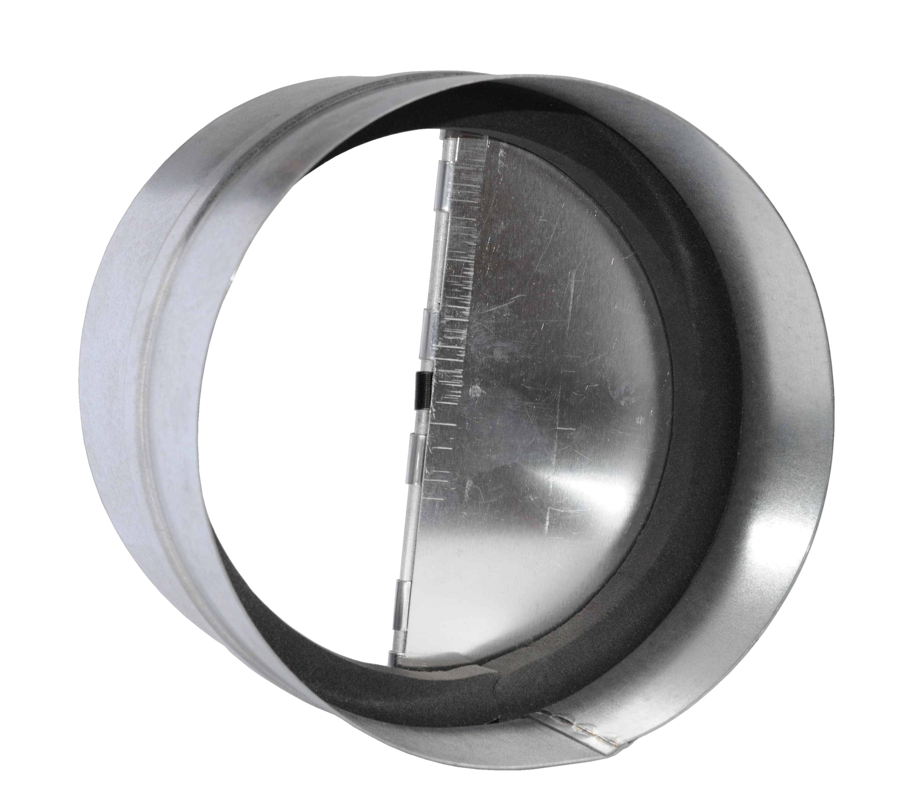 okrągła klapa zwrotna umożliwia przepływ powietrza tylko w jednym kierunku aluminiowe lamelki podczas zamykania dotykają piankowej uszczelki dzięki czemu brak jest hałasu w instalacji wentylacji kanałowej